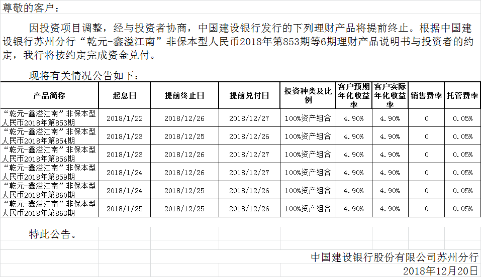 中国建设银行苏州分行“乾元-鑫溢江南”非保本型人民币2018年第853期等6期理财产品提前兑付公告